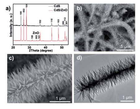 圖1:(a)CdS納米帶與CdS/ZnO樹枝狀異質(zhì)結(jié)的XRD峰對(duì)比。(b)低倍數(shù)SEM下觀測(cè)到的CdS/ZnO樹枝狀異質(zhì)結(jié)。(c)(d)分別對(duì)應(yīng)SEM和TEM下觀測(cè)到的CdS/ZnO樹枝狀異質(zhì)結(jié)。