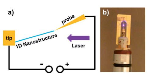 圖2:(a)原位透射電子顯微鏡光學(xué)-光電測(cè)量系統(tǒng)應(yīng)用示意圖。(b)原位透射電子顯微鏡光學(xué)-光電測(cè)量樣品桿頭部實(shí)拍圖。