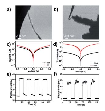 圖4:(a)(b)分別對(duì)應(yīng)CdS納米帶和CdS/ZnO異質(zhì)結(jié)安置在原位光學(xué)-光纖樣品桿中的TEM圖像。(c)(d)分別對(duì)應(yīng)CdS納米帶和CdS/ZnO異質(zhì)結(jié)I-V曲線的開關(guān)特性。(e)(f)分別對(duì)應(yīng)CdS納米帶和CdS/ZnO異質(zhì)結(jié)對(duì)周期性光信號(hào)的響應(yīng)特性。