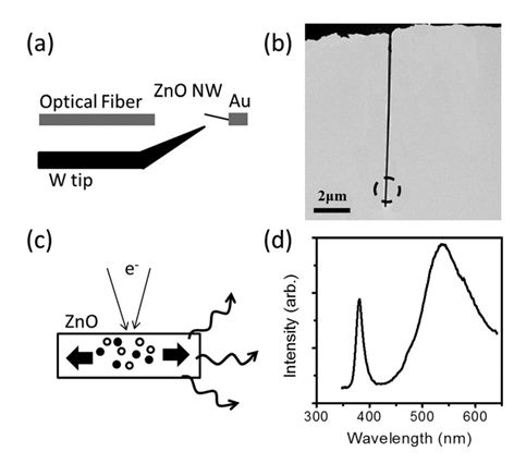 圖1:(a) 原位透射電子顯微鏡光學(xué)-光電測(cè)量系統(tǒng)應(yīng)用原理圖;(b) 單根ZnO納米線的TEM圖像,電子束被聚焦在納米線的末端。(c) 圖解ZnO納米線的發(fā)光機(jī)制; (d) 典型的CL譜。