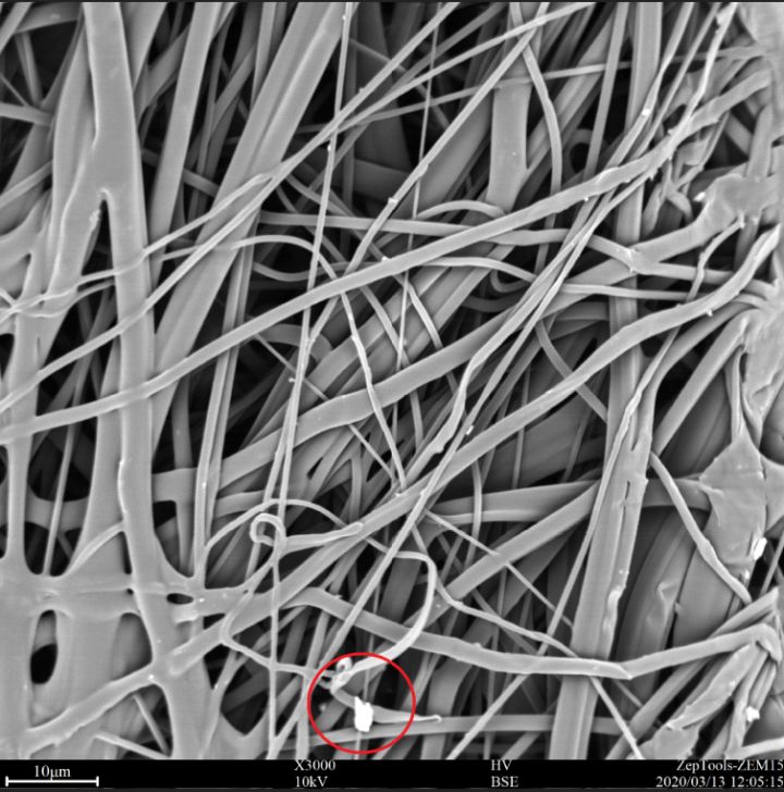 圖4 累計使用過4小時的醫(yī)用外科口罩3的中間過濾層(熔噴布層)。纖維結構排布和前兩種類似,同時發(fā)現(xiàn)直徑3-4 um的顆粒物。