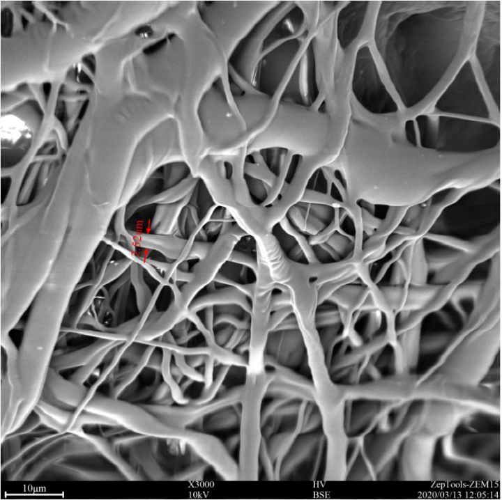 圖7 三無口罩中間層的截面掃描電鏡圖。可以看到纖維排列松散,纖維粗大,孔洞也很大,無法有效過濾。