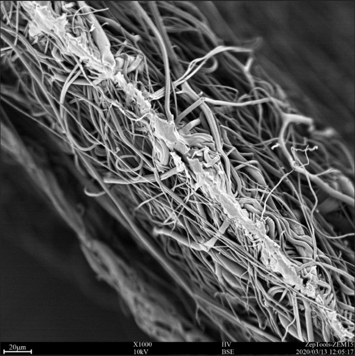 圖6 醫(yī)用口罩中間過濾層(熔噴布)截面的掃描電鏡圖。從截面看纖維排布致密,中間有一道明顯的壓印痕跡,是口罩生產(chǎn)過程中壓制導致的。